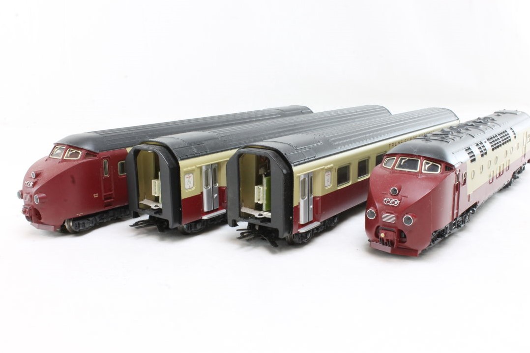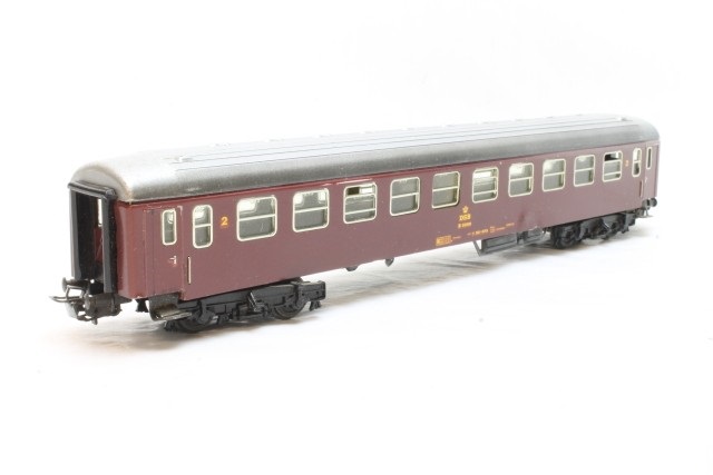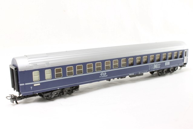 Periode 4De passagierswagons zijn allen uit periode 4. Dit is de periode die ongeveer loopt van 1965 tot eind jaren 80. De stoomtreinen waren net op grote schaal uit dienst genomen en zijn vervangen door diesellocs en elektrische locomotieven. Op mijn baan is 80cm de prettige treinlengte qua ruimte en blokken (zonder de locomotief). Dat betekent gemiddeld vier standaardlengte passagiersrijtuigen of 3 rijtuigen op werkelijk H0-formaat (zoals de TEN, zie onderstaand) per sleep. De perrons van de stations zijn 105cm lang, dus dat past netjes.