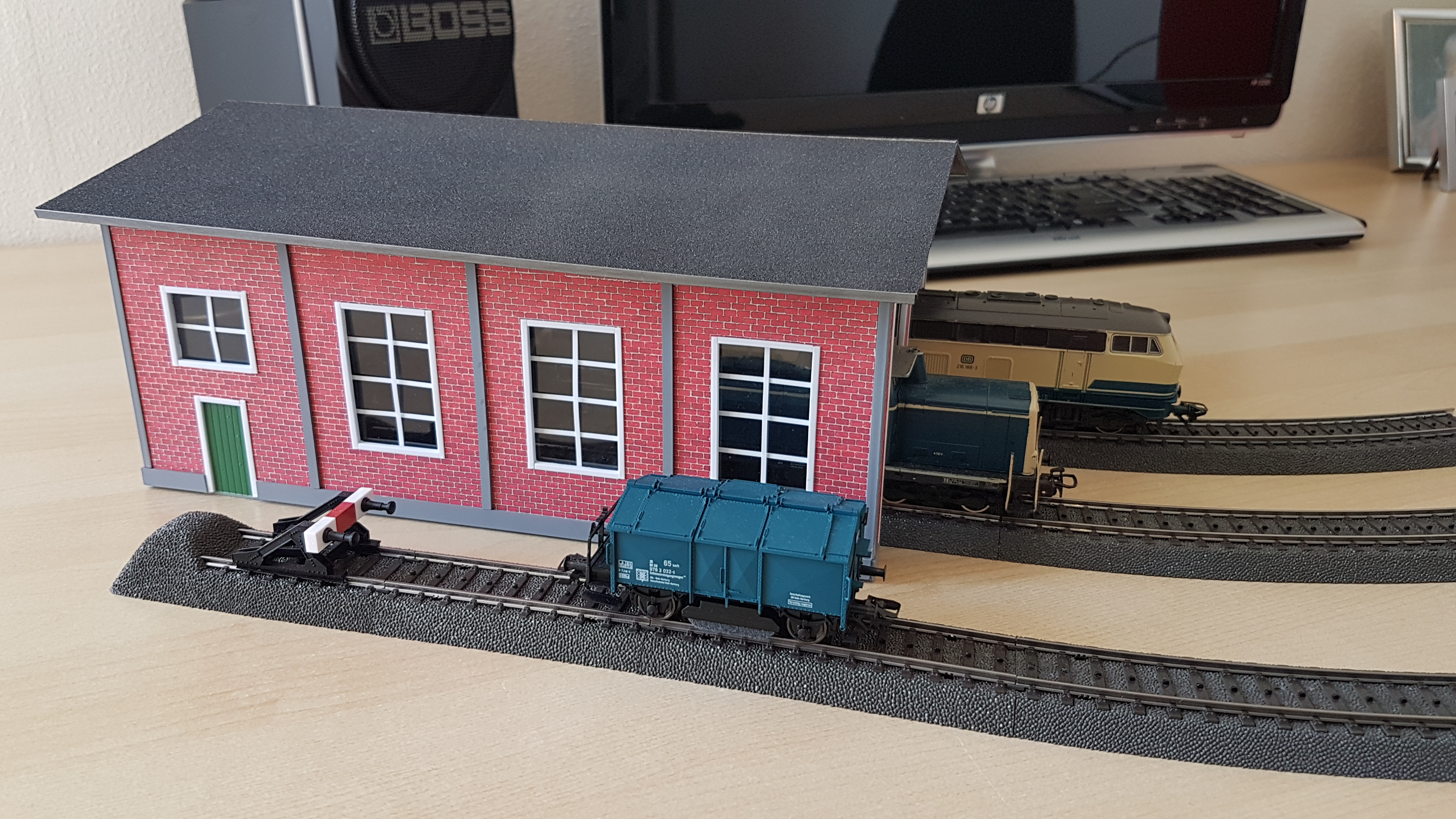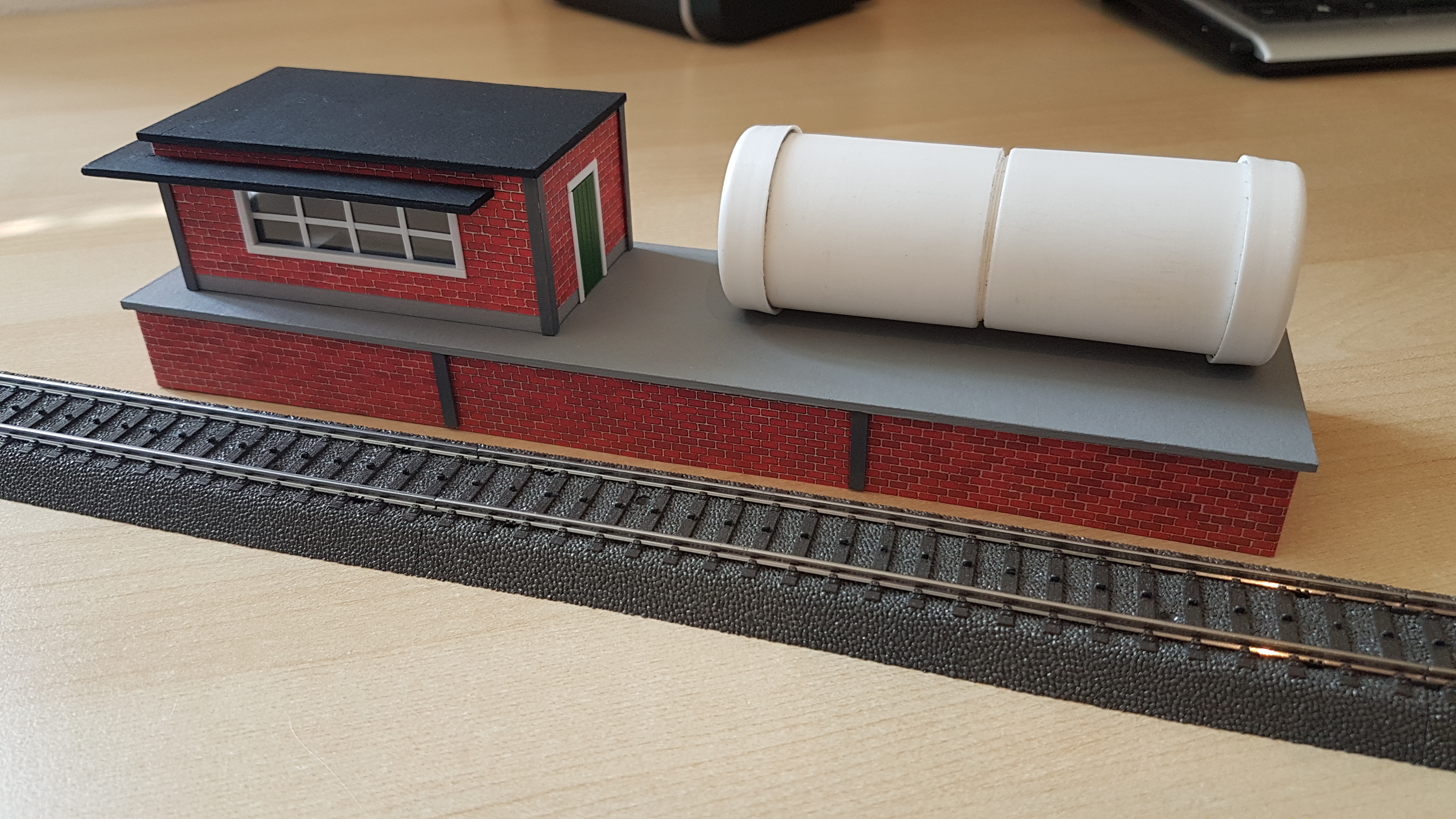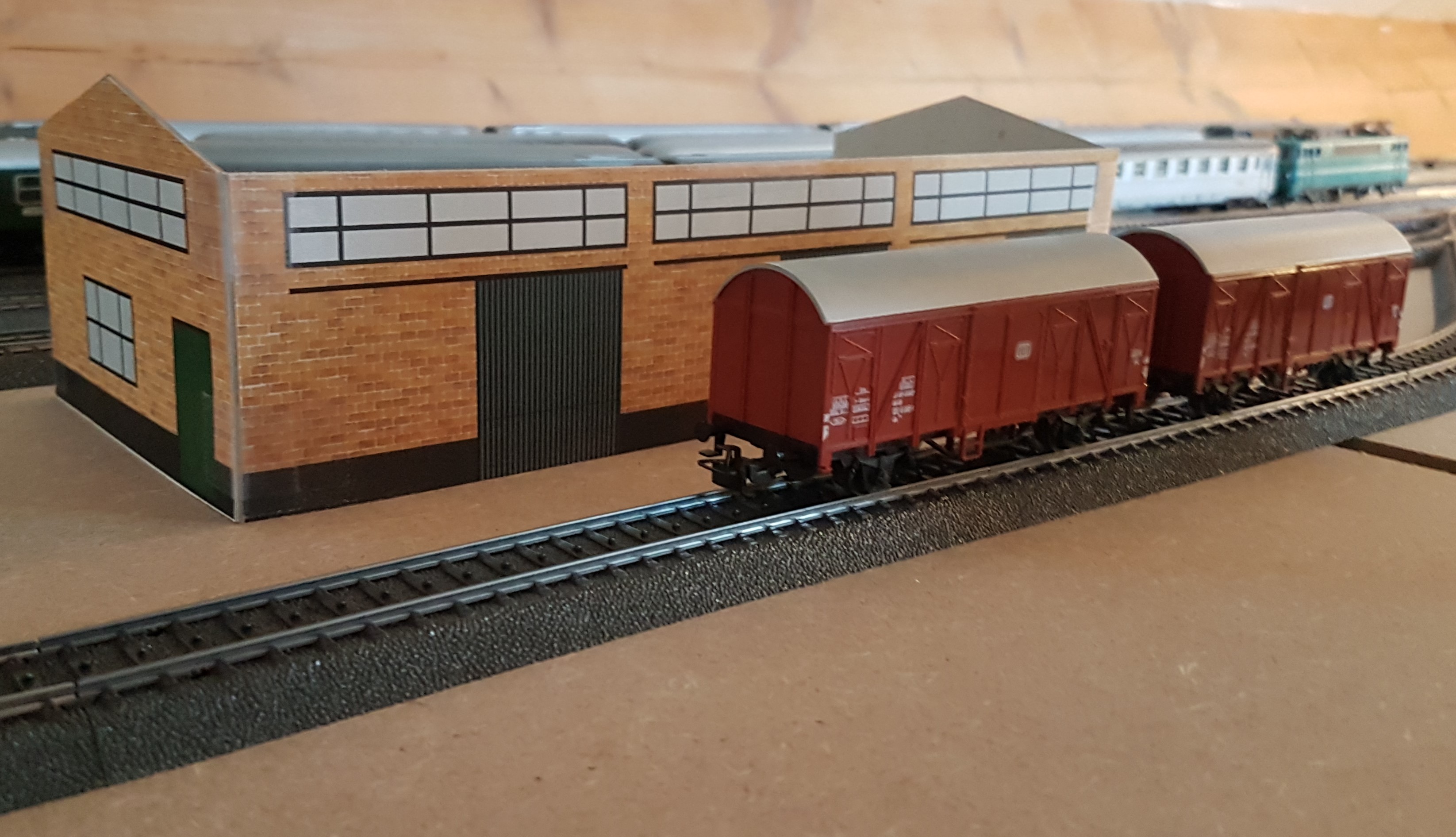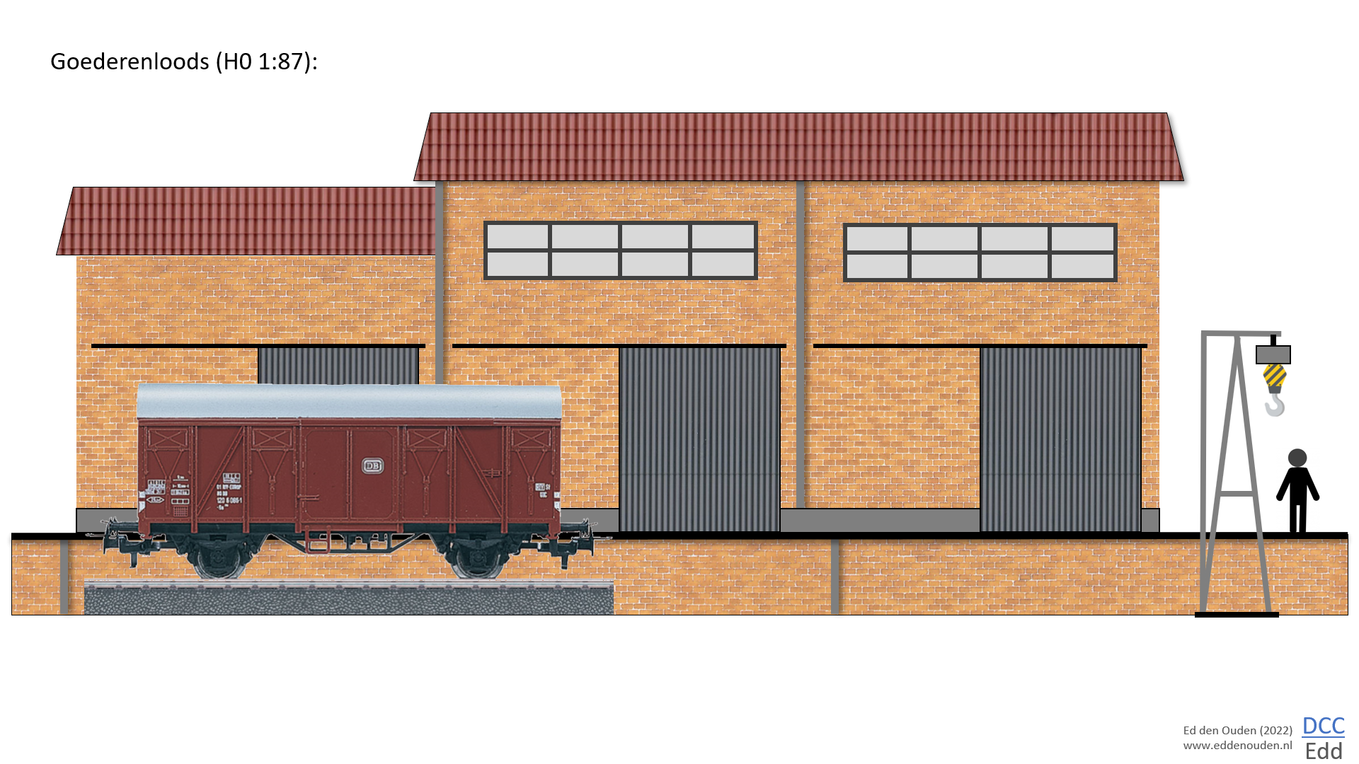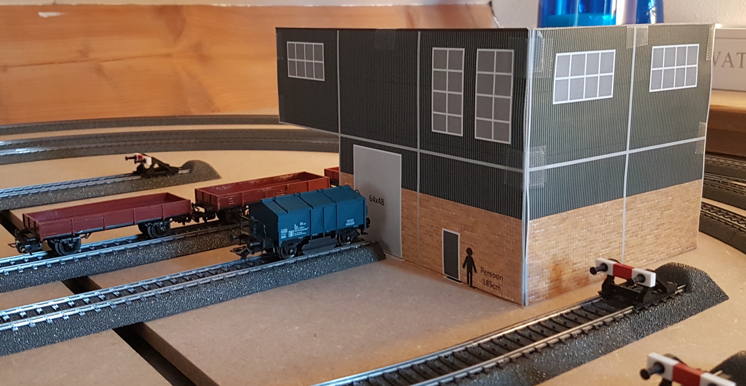 Op basis van bovenstaande testmaquette van de goederenloods besloot ik om het dak in 2 hoogtes uit te voeren (want anders was het maar een saai blok). Tevens koos ik ervoor om het hele gebouw op een laad- en losplatform (20mm) te zetten. Het nut van de simpele en snelle testmaquette was duidelijk!