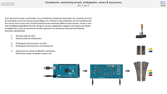 Klik op de link bij onderstaande afbeelding voor een PDF met de bouwbeschrijving van de Arduino DCC-decoder RX. Deze bestaat uit een Arduino Nano, Uno of Mega, een PCB, enkele losse componenten en de schakelunit (zie verderop) die je aan de output kant nodig hebt om onderdelen aan te sturen: